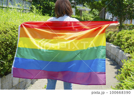 虹色の旗を持った性的マイノリティの女性の後ろ姿