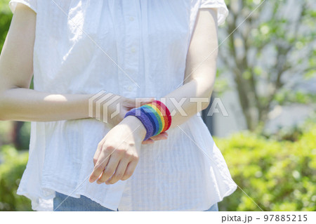 虹色のリストバンドをするセクシャルマイノリティの女性 顔無し