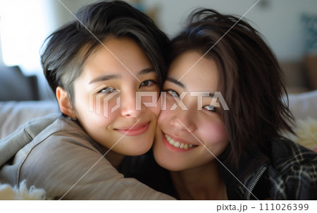 笑顔で寄り添うレズビアンのカップル AI生成画像