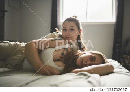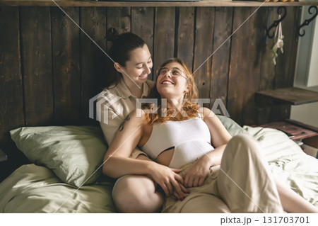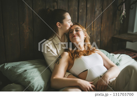 Happy couple cuddling on their bed at home. Romantic young LGBTQ