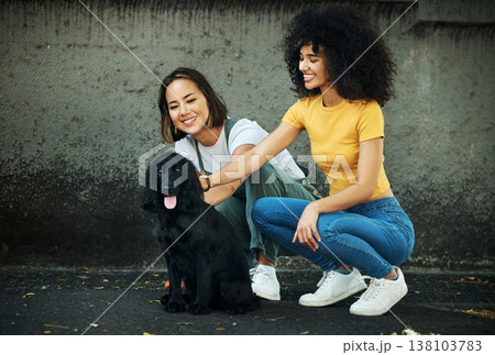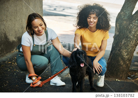 Love, smile and a lesbian couple walking their dog together outdoor in the city for training or exercise. LGBT, health and a happy woman with her girlfriend to teach their pet animal on a leash
