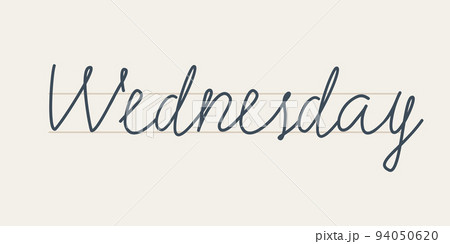 Wednesday. Handwritten letters of the name of the day of the week. Lettering written on a straight line. Hand drawn text on white background.