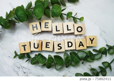 Hello Tuesday alphabet letter with green leave flat lay on marble background