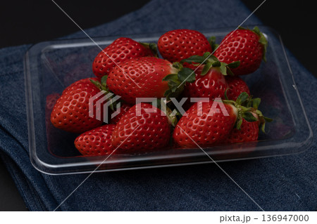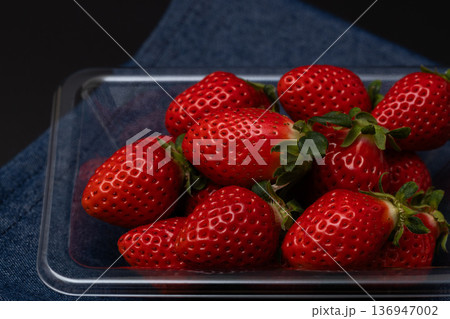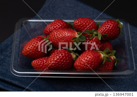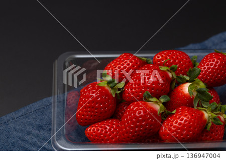 透明のプラスチックトレーに並べられた苺 黒背景のダークイメージ