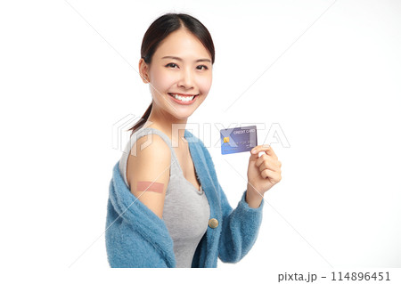 young asian women smiling after getting a vaccine, and show credit card holding down her shirt sleeve and showing her arm with bandage after receiving vaccination on white background,