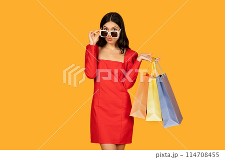 A woman wearing a vibrant red dress stands holding multiple shopping bags in her hands. bags she holds suggest she has been shopping for items, adjusting her sunglasses