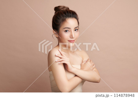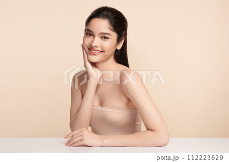 Beautiful young asian woman with clean fresh skin on beige background, Face care, Facial treatment, Cosmetology, beauty and spa, Asian women portrait.