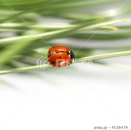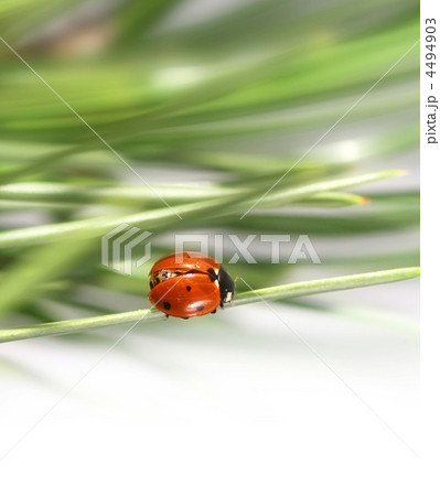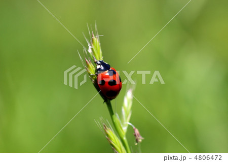 葉の上のテントウムシ ナナホシテントウ 昆虫 小型昆虫 てんとう虫 緑背景 赤い虫 ネイチャー