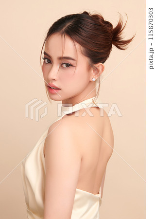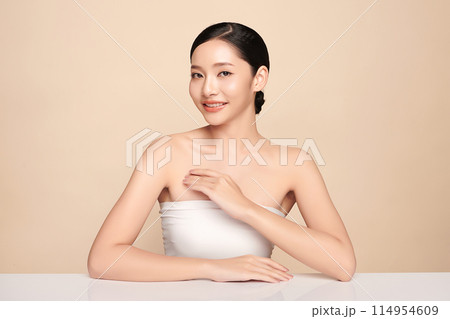 Beautiful young asian woman with clean fresh skin on beige background, Face care, Facial treatment, Cosmetology, beauty and spa, Asian women portrait.