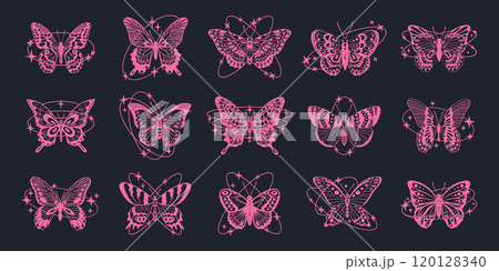 Butterflies y2k symbols. Abstract y2k aesthetic insects, butterfly silhouettes with sparkle stars and oval shapes decor flat vector illustration set. Pink butterflies on dark background