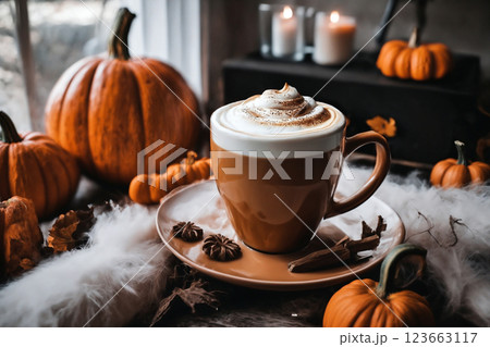 for halloween holiday, decoration with latte and pumpkins on a windowsill, beautiful autumn landscape outside the window, still life, festive background