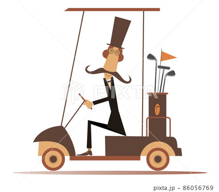 Funny long mustache man rides the golf cart illustration. Cartoon long mustache gentleman in the top hat is going to play golf in the golf cart isolated on white