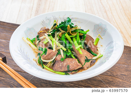 注意)湯気はレタッチ合成です。牛レバーのレバニラ炒め。中華料理。国産牛レバー、ニラ、モヤシ炒め。