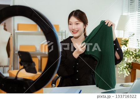 Asian vlogger woman influencer, SME retail store owner smile enjoy selling show live sale online screen smartphone.