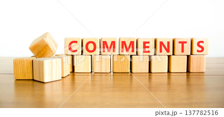 Comments comment word symbol. Concept word Comments on beautiful wooden blocks. Beautiful wooden table white background. Business support help comments comment word concept. Copy space.