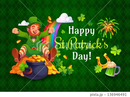 Happy St Patrick s day holiday greeting card. Irish party banner with leprechaun character, gold in pot and clover. Saint Patrick day celebration vector greeting card, Ireland culture holiday flyer