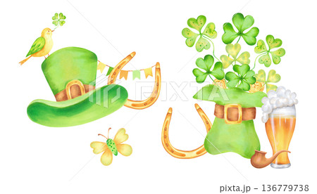 Watercolor illustration for St. Patrick's Day featuring a leprechaun hat, shamrock, horseshoe, gold coins, pipe, beer glass, bird, butterfly. Ideal for card, invitation, print, holiday decorations.