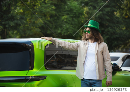 Man standing near green car celebrating holiday