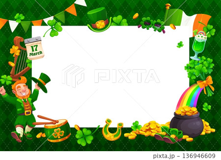 Happy St Patrick's day Irish holiday greeting card frame. March celebration vector invitation, Saint Patrick party greeting card or banner border with happy leprechaun, clovers and pot of gold coins