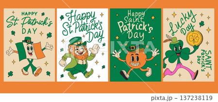 Funny St Patrick day groovy Irish characters posters. Cartoon leprechaun, green beer mug, golden horseshoe and pot of gold personage with shamrocks, stars, and playful typography on retro backgrounds