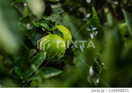 Green limes on a tree. Lime is a hybrid citrus fruit, which is typically round, about 3-6 centimeters in diameter and containing acidic juice vesicles. Limes are excellent source of vitamin C
