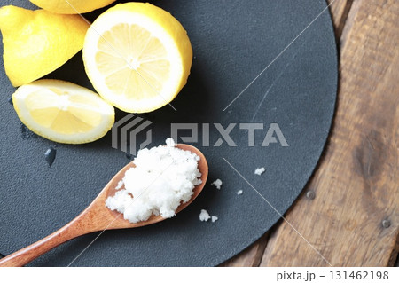 混ぜる前の塩レモンの材料 粗塩とノーワックスレモン
