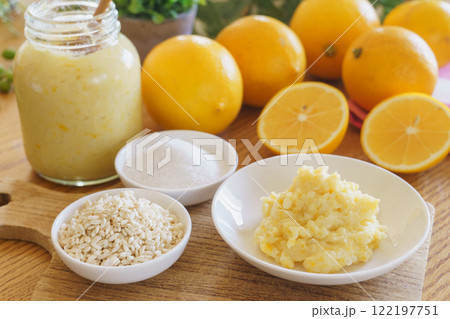 混ぜる前のレモン麹の材料 米麹と粗塩とノーワックスレモン