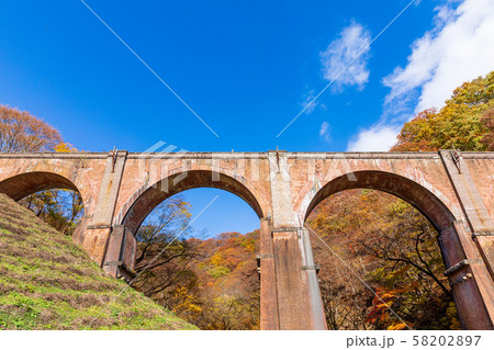 空撮 紅葉 群馬県めがね橋の風景 秋
