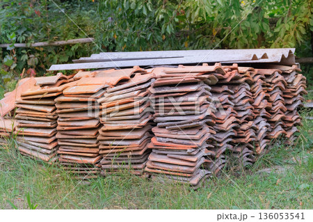 Ceramic roofing tiles stacked in yard. Pile of terracotta colored tiles. Traditional building material. Roof tiles.