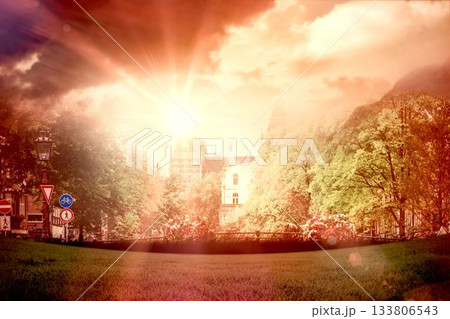 Iron railing is holding flower boxes under dawn flare, flat design with vintage lamp and signs
