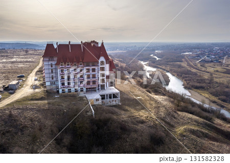 Aerial view of unfinished multistoried residence, hotel or cottage building with stucco wall, cast iron balcony railings, steep shingle roof and shiny windows on rural landscape background.