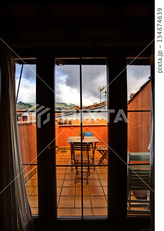 Cozy rooftop terrace with orange walls, wooden table and chairs, viewed through glass doors to a cloudy sky