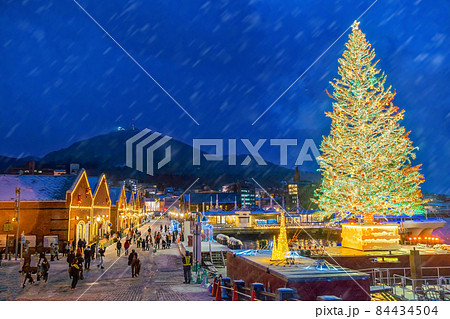 Cityscape of the historic red brick warehouses at twilight in Hakodate Hokkaido Japan in winter