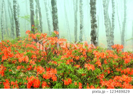 レンゲツツジ咲く新緑の覚満淵