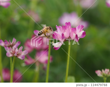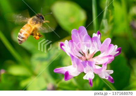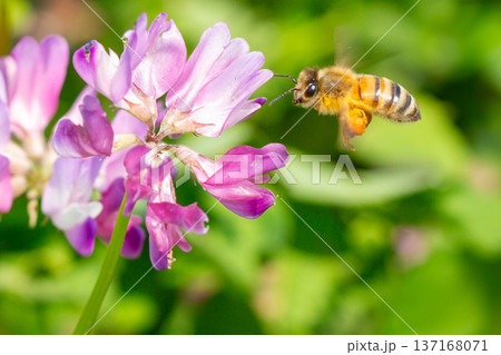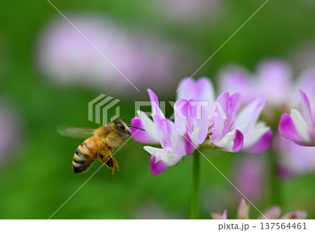 レンゲの花にミツバチが飛んでいる