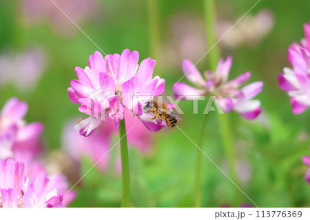 レンゲ畑のミツバチ 蜜蜂 レンゲソウ 蓮華草 ハチミツ 花 5月 季節 畜産 ビジネス 養蜂