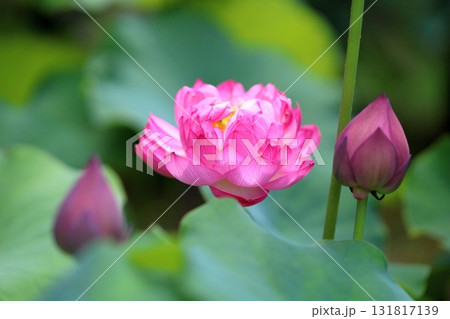 蓮田に咲く大輪のピンク色の蓮の花