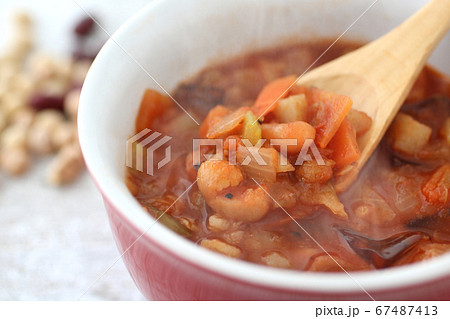 ヘルシーで栄養満点な「豆と雑穀のスープ」、朝食や昼食イメージ。