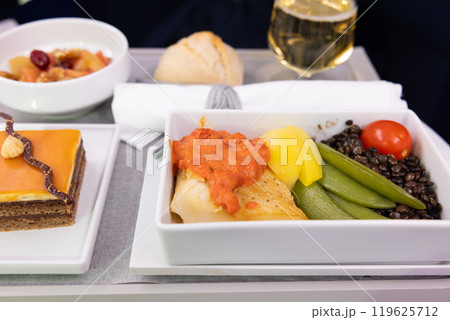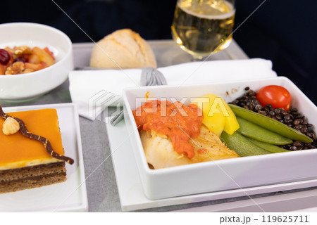おいしいビジネスクラスの機内食オヒョウの魚料理と野菜とシャンパン、チョコレートケーキ