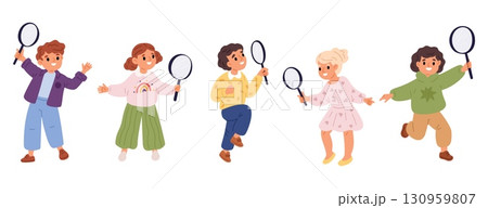 Little girls and boys with magnifying glasses. Children explore world. Happy young people looking through magnifiers. Discovery and exploration. Detective investigation. Vector concept