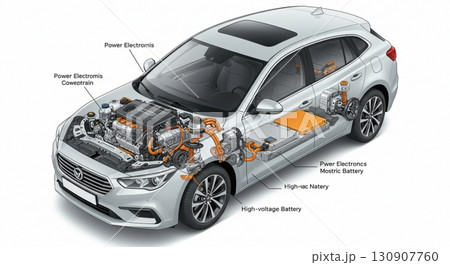 EV自動車の主要パーツと配線のワイヤーフレームのスケルトンCG画像