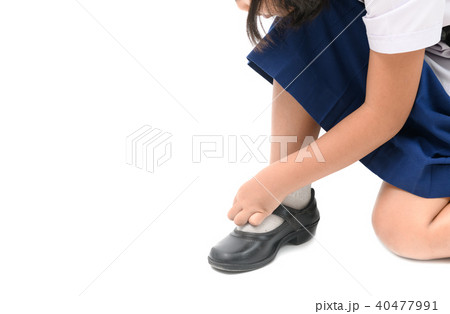 asian kid girl lacing student shoes isolated