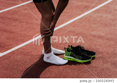 陸上競技場のトラックでフィニッシュ後シューズを脱いで脚をケアする男性ランナーの下半身