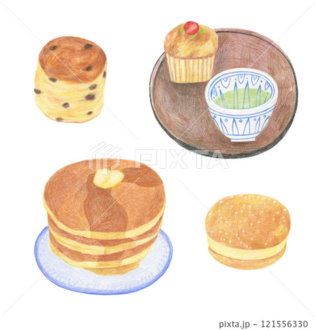 色鉛筆で描いたティータイムのお菓子のイラストレーション