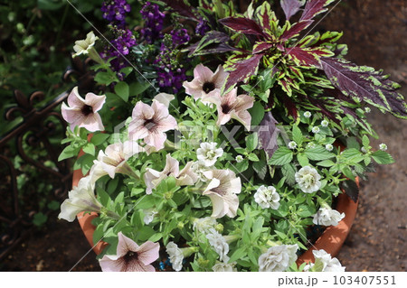 アンティークカラーのペチュニア、コリウスの寄せ植え