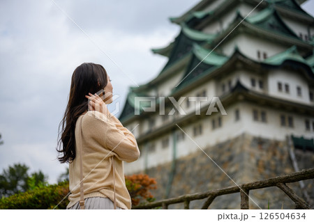 お城と前ボケの女性の佇まい