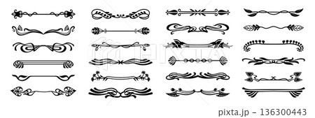 Art nouveau dividers with floral flourishes and calligraphic scrollwork vintage borders, baroque invitation and book separators, ornamental design. Black silhouette headers isolated vector set