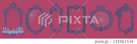 Gothic frame set. Spooky vintage border. Hand drawn branches, cobwebs and burning candles. Raven silhouette at night. Magic moon. Picture decoration. Vector isolated halloween isolated illustration