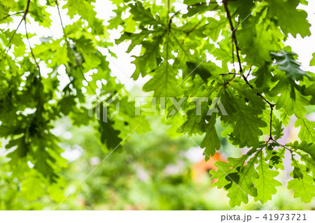 green leaves of oak tree and view of country house