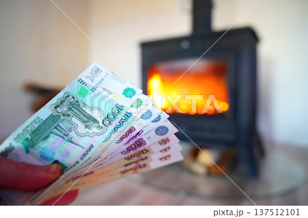 Heating payment. Save money wood stove. Russian ruble banknotes for payment of heating firewood.
